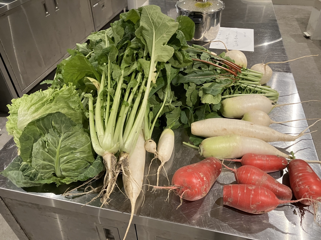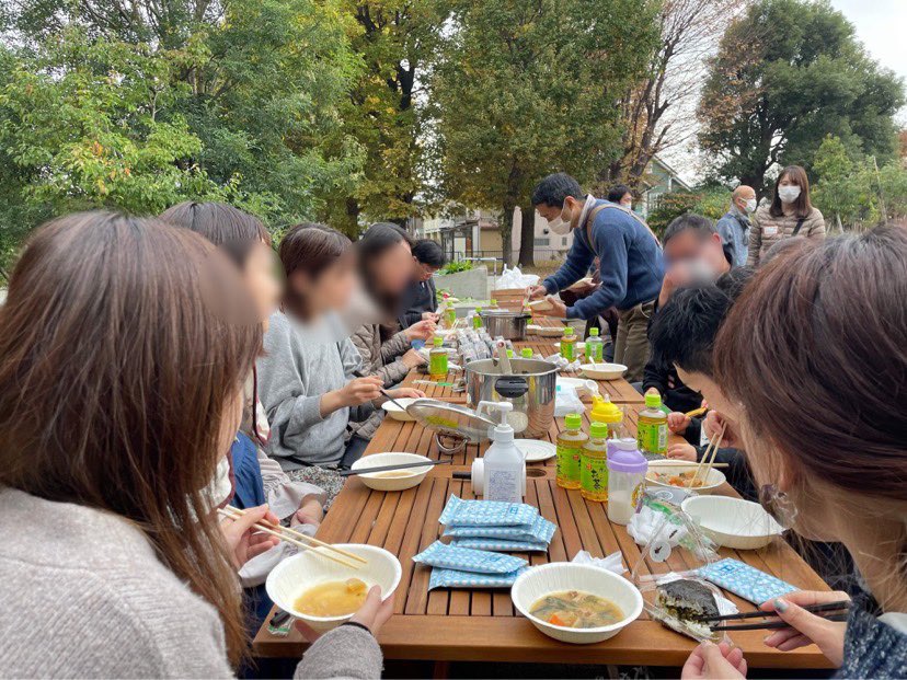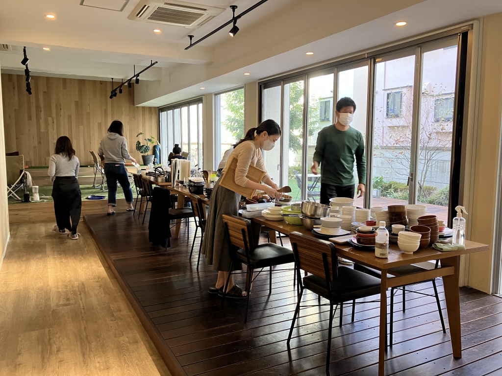 採れたての大根を剥いて、あらかじめシェアキッチンで調理していた豚汁に投入。ぐつぐつ煮込み、三鷹エリアで愛されているおにぎり屋さんのおにぎりと共に味わいました。コロナ禍で「お隣さん同士」の交流イベントをあまり実施できていなかったこともあり、この日はシェアプレイス三鷹とアールリエット三鷹の入居者同士で、シェアハウスでの暮らしぶりや子育てなどについて語らう機会となりました。