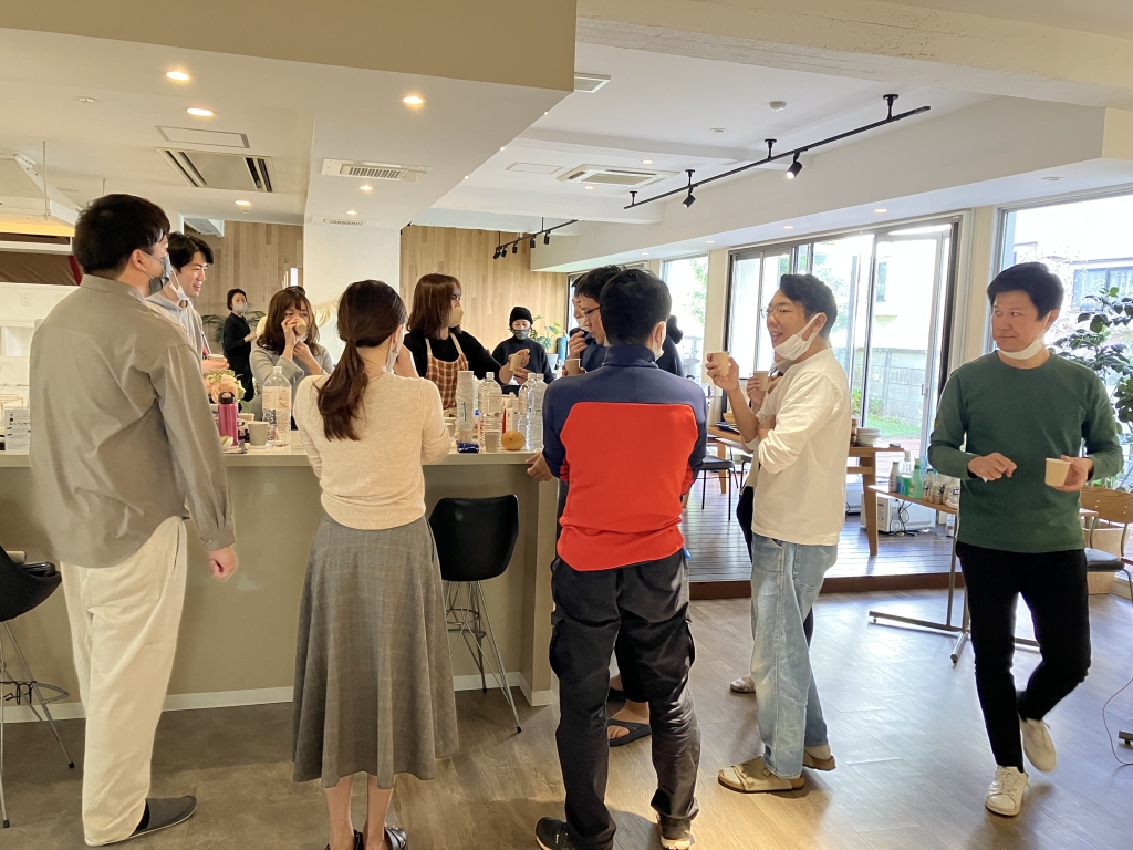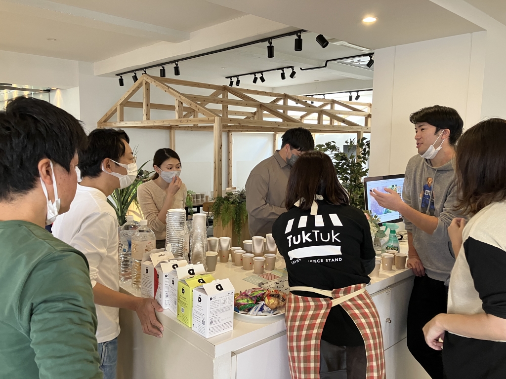 様々なフレーバーのコーヒーや緑茶などを淹れて、好みの味のカプセルにシールを貼っていきます。この投票結果が、物件内の「TukTuk」の販売ラインナップに反映されました!ピカピカになったキッチンに香ばしい匂いが漂って会話が弾みました。