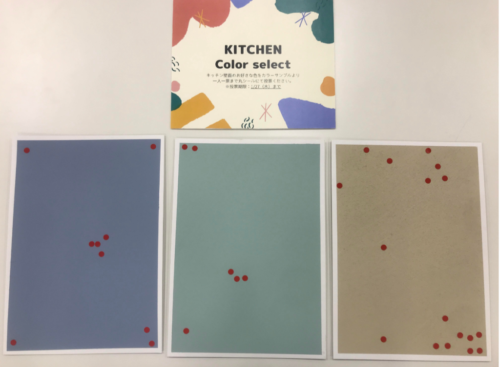 まずは、壁面の色選びからスタート。「シェアプレイス田園調布南」にお住まいのみなさまに、ブルー、グリーン、ベージュの3色のなかからお好きな色を選んでいただきました。一人一票まで投票できる仕組みです。