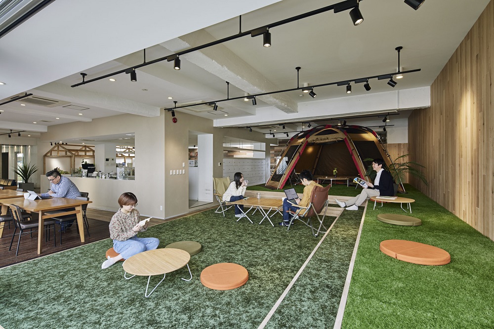 こちらは、大きなテントが特徴のリラックススペース(SHIBAFU)。屋内に居ながら、アウトドアのような寛ぎ方ができます。