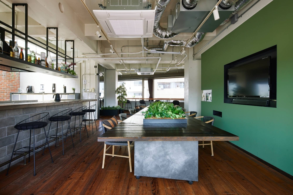カフェにいるような雰囲気で食事ができるビックテーブルを設置し、テレビ壁面の色を空間にやさしいグリーンに塗り替え、全体的に明るい印象にしました。
