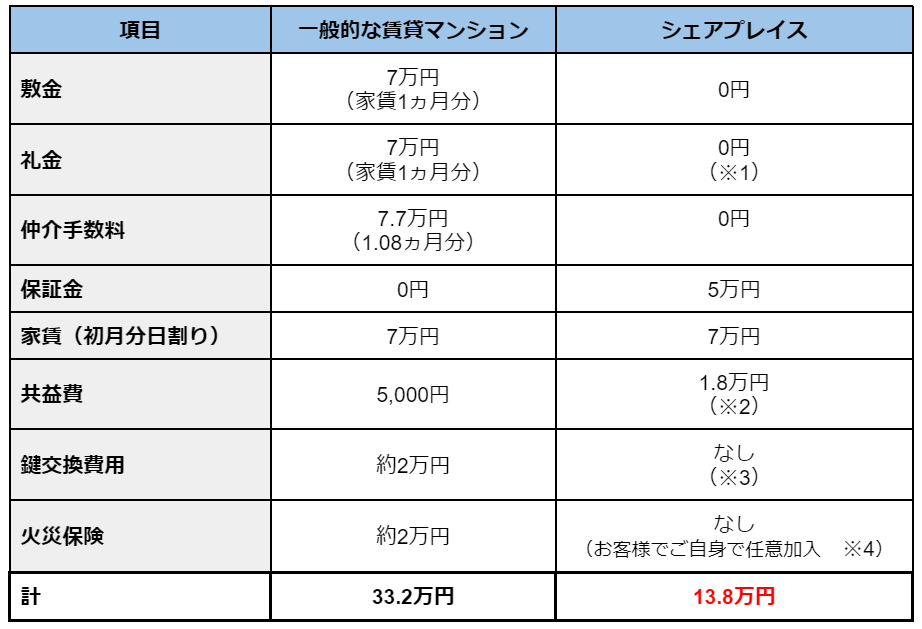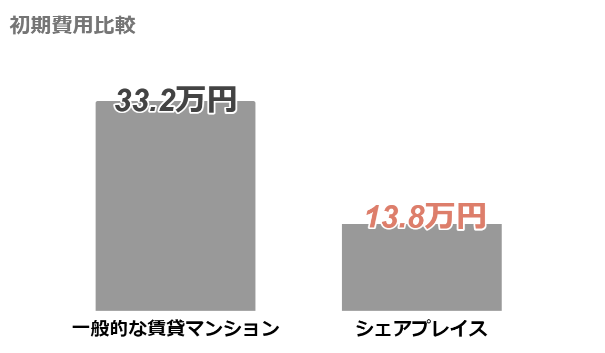 一般的に、賃貸物件を借りる際には敷金や礼金などが必要ですが、シェアプレイスは無料。初期費用をぐっと抑えることができます。(礼金は、一部発生する物件もございます。)