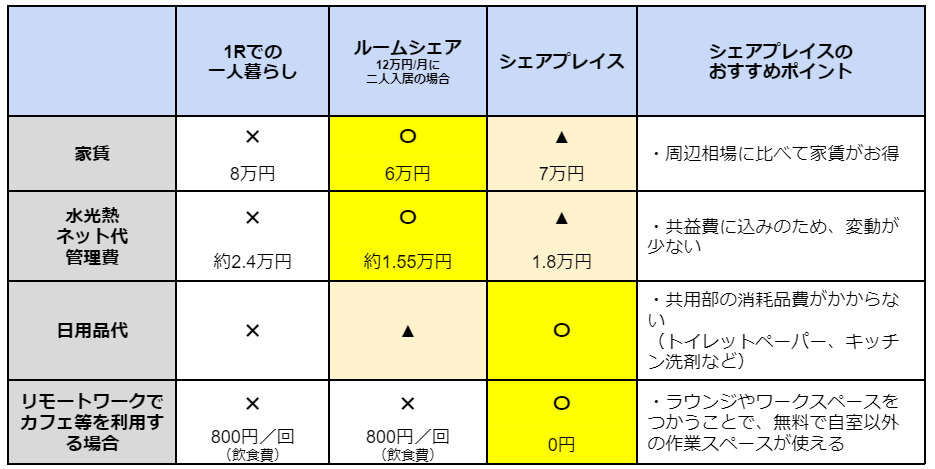 すべて自分のペースで生活できるため自由度は◎、プライバシーも守られる。一方費用面では、すべて自分持ちになるため負担は大。初めての一人暮らしの場合、心細さを感じることも。・ - ルームシェア