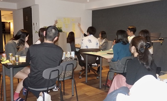時間が来たところで、それぞれのチームで出たアイデアを全体に向けて発表します。皆さん興味津々。