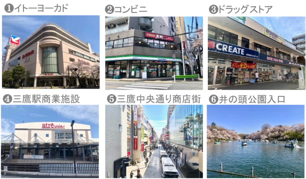 物件の反対側、三鷹方面へ向かうと駅前には大小様々な店が立ち並ぶ「三鷹中央通り商店街」が広がります。飲食店や雑貨店等、こだわりの詰まった個人店も多く立ち並ぶこちらの商店街では、ご自身のとっておきのお気に入りのお店を見つけてみてはいかがでしょうか。(❺)