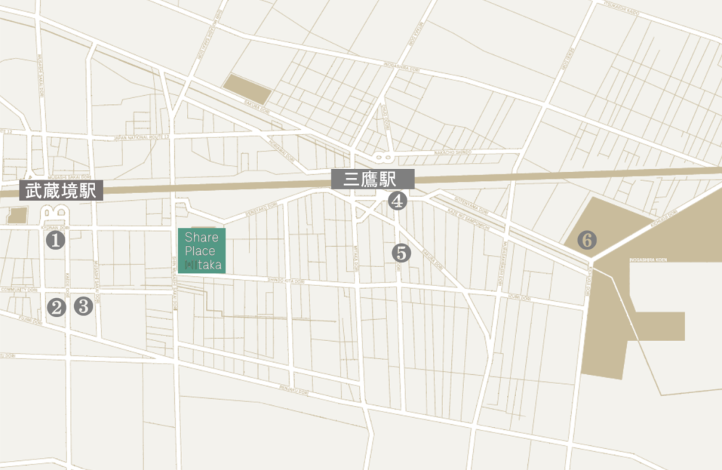 シェアプレイス三鷹はJR中央線「武蔵境」駅から徒歩8分、「三鷹」駅から徒歩11分の住宅街に位置します。