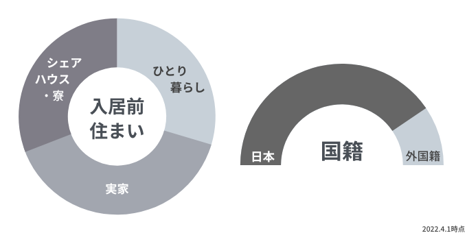 シェアプレイス三鷹に入居する前の住まいは1人暮らし+実家住まいからのお引越しの方が約70%と、初めてのシェアハウス暮らしの方も多い物件となっています。