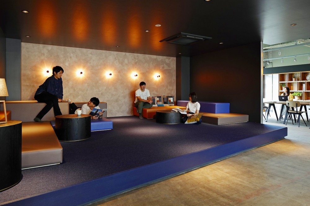 在宅ワーク中の作業に煮詰まった時、フラッとコーヒーを飲みに立ち寄れる仲の良い常連でいっぱいのお気に入りのカフェのような空間の1階ラウンジ。