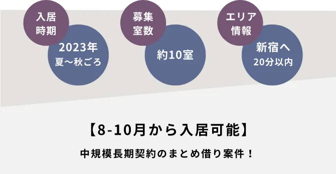 新入社員や上京する中途採用の入社や、異動の多い法人様等、ご要望に応じて数室程の小規模~10室前後の中規模のまとめ借りにもご対応。