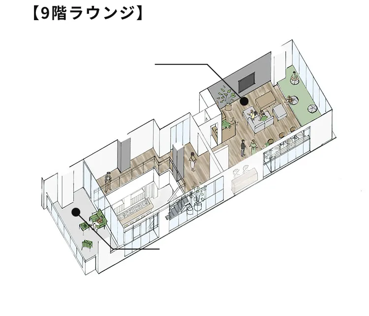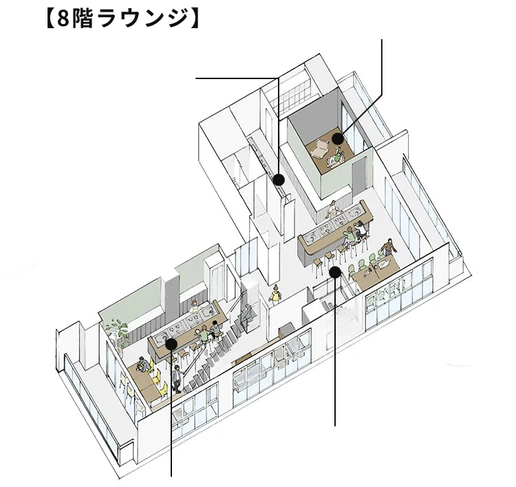 01ユニットタイプのご契約企業様も8・9階のシェアラウンジ等の共用施設利用可能!