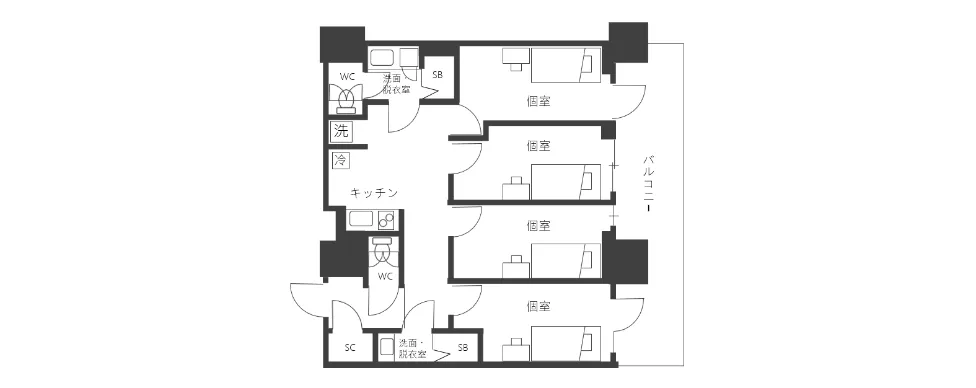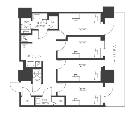 - 74.63㎡~92.09㎡(ユニット内個室約10㎡)
