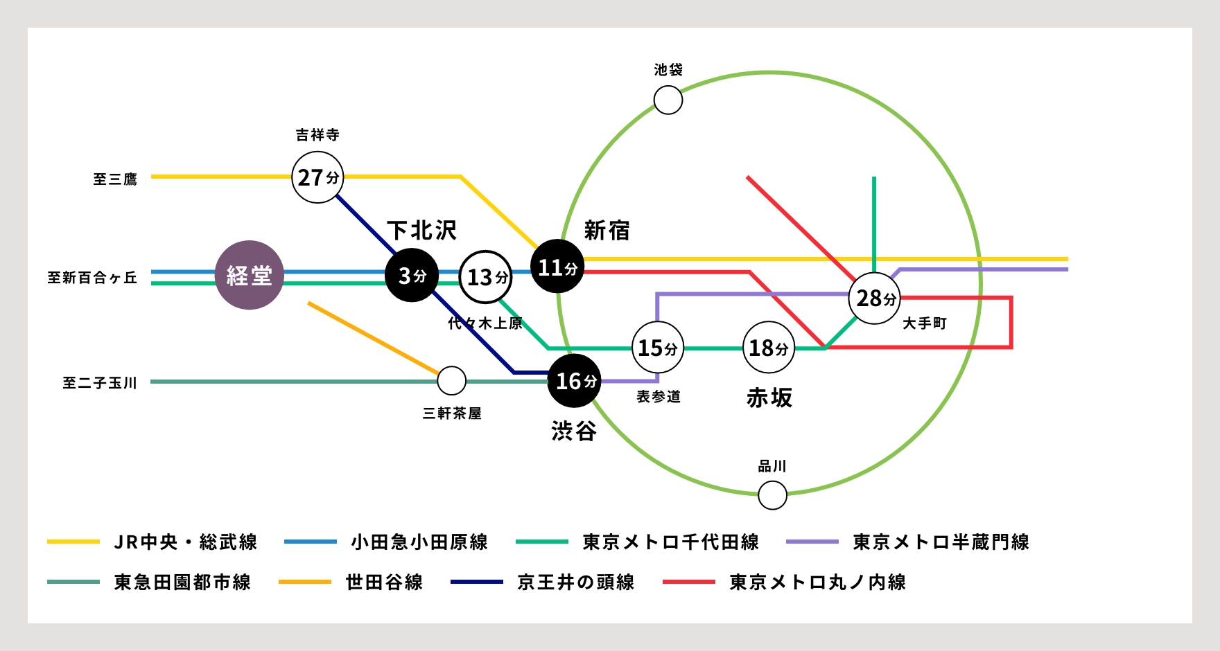 昔から経堂の街に根付いた地元の方が築き上げた懐かしい雰囲気を感じる街並みエリアと、東京農業大学の学生向けにリーズナブルでコスパの良い店舗や飲食店が数多く立ち並ぶ農大通り商店街などの若者に嬉しい顔も持つ街なので、飽きの来ない住み良い街となります。