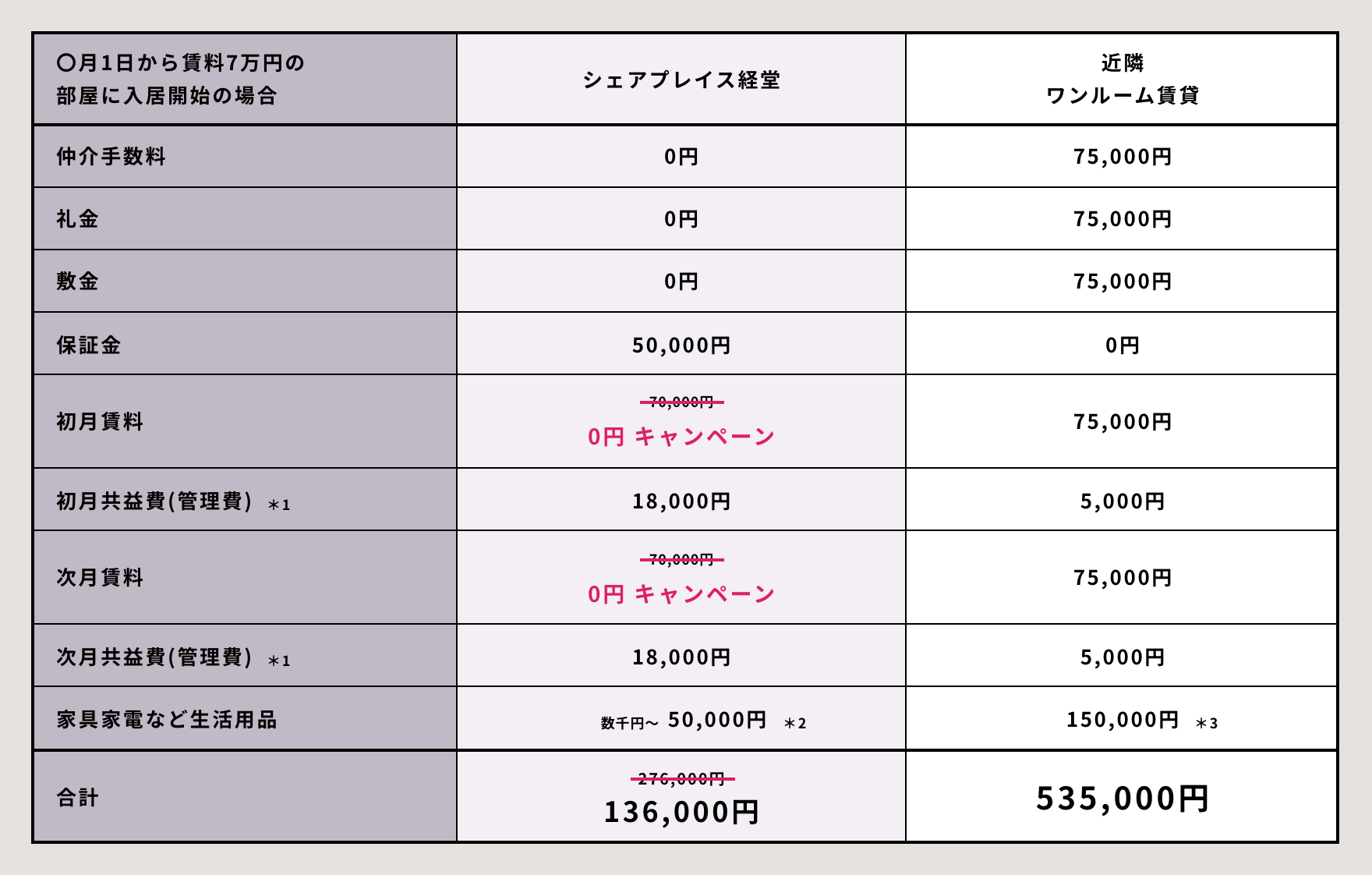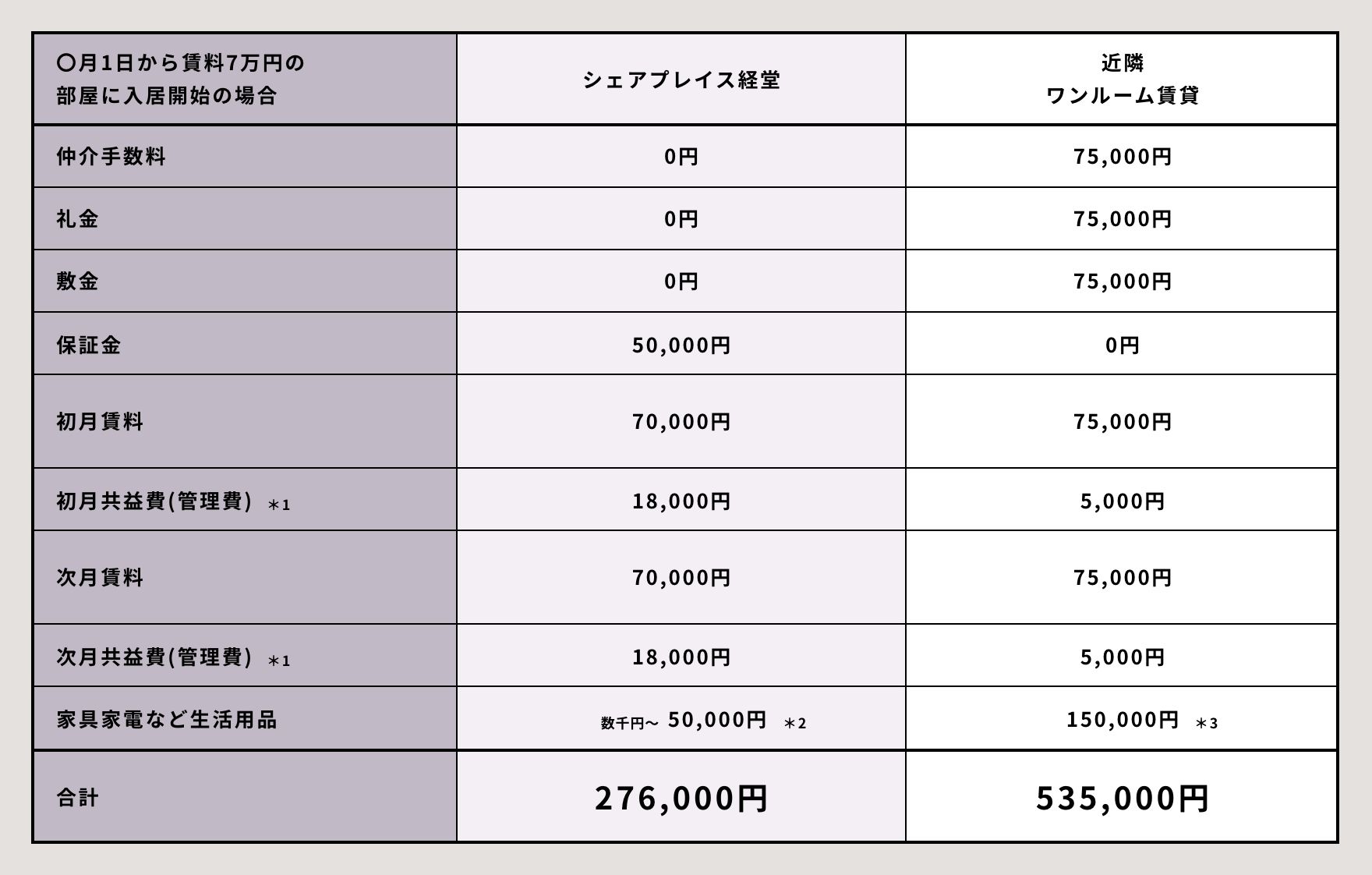 - *1・・・共益費(管理費):シェアプレイス経堂は水道光熱費・インターネット料金が共益費内に込み。(近隣賃貸は別途個人契約が必要です)