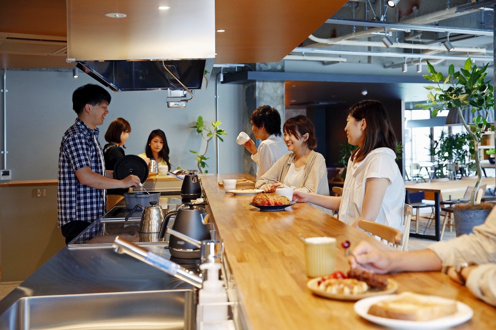 キッチンのカウンターは料理する人と、作り終わって食べる人が気軽に世間話を楽しむ空間にも。キッチンでの交流で新たな友人が増えた人も多いそうです。