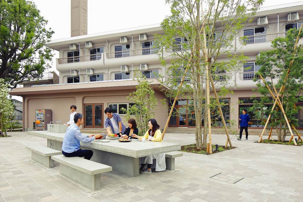 シェアプレイス三鷹のある同敷地の「リエットガーデン三鷹」内には”食の広場”、”森の広場”という地域の皆さんとの共用空間があります。特に食の広場は大きな石のテーブルが設けられているため、たまには気分転換に外で開放的に食事を楽しむことも可能です。(火気厳禁のためバーベキューは禁止です。)