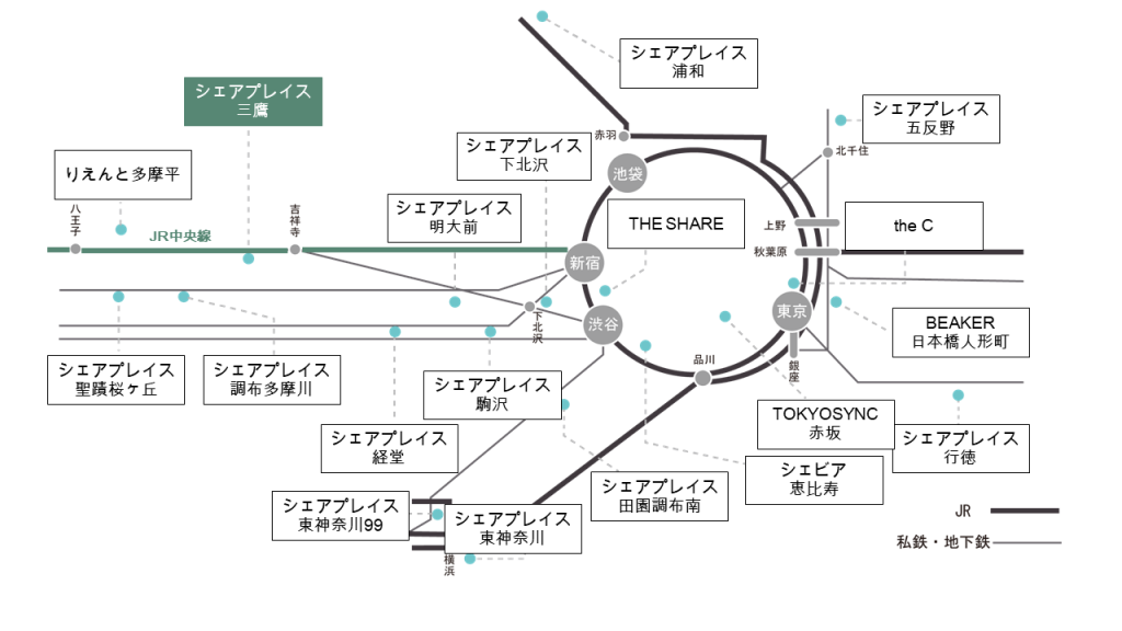 シェアプレイス三鷹はJR中央線「武蔵境」駅から徒歩8分、「三鷹」駅から徒歩11分の住宅街に位置します。