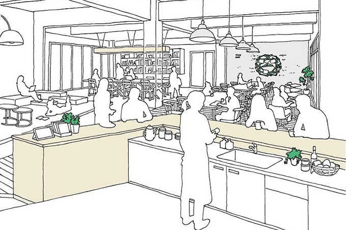 「シェアプレイス三鷹」の1階の共用部には、ダイニング、キッチン、リラックススペース、ライブラリーという空間が広がっています。