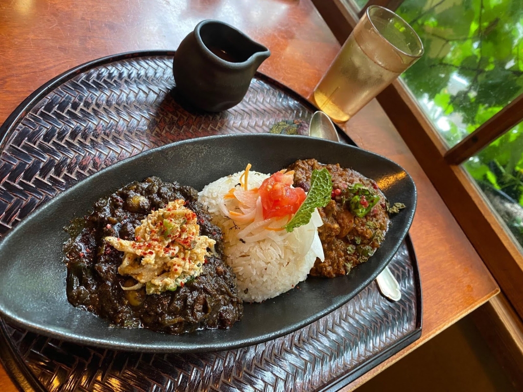 ランチタイムは旬の野菜をふんだんに使った3種のカレー(鶏キーマ、ポークキーマ、牛豚キーマ)を堪能できる。メニューはあいがけ(1,100円)と全がけ(1,350円)。