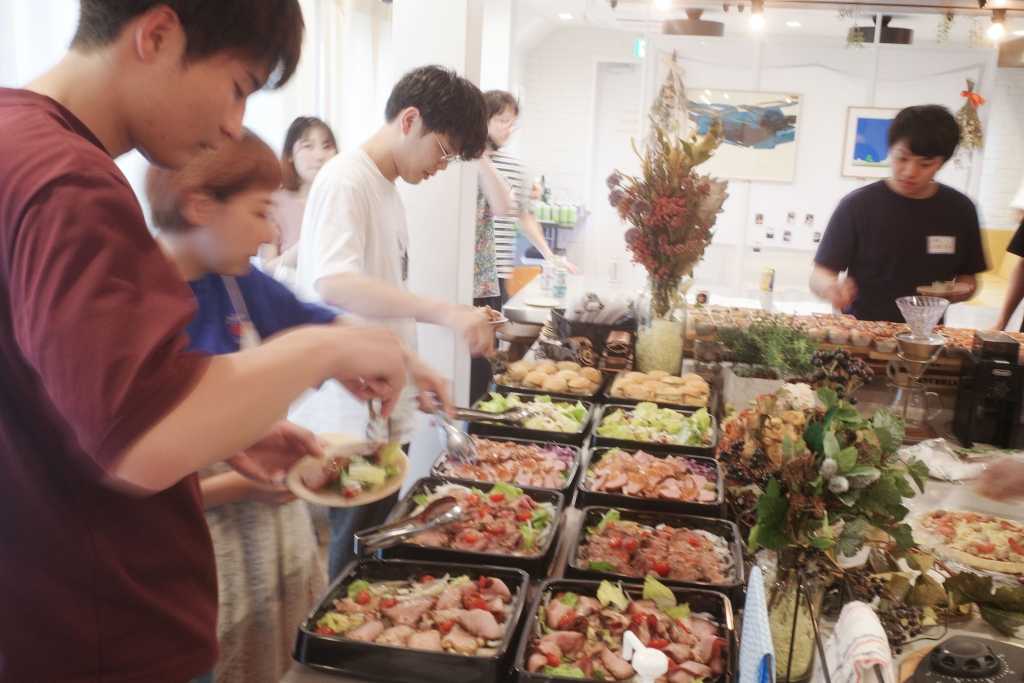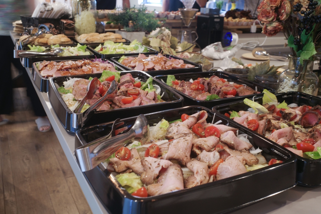 ケータリングの方が来てくださって、キッチンにはおしゃれな装飾と料理が並びました。テンションが上がるメンバー一同。